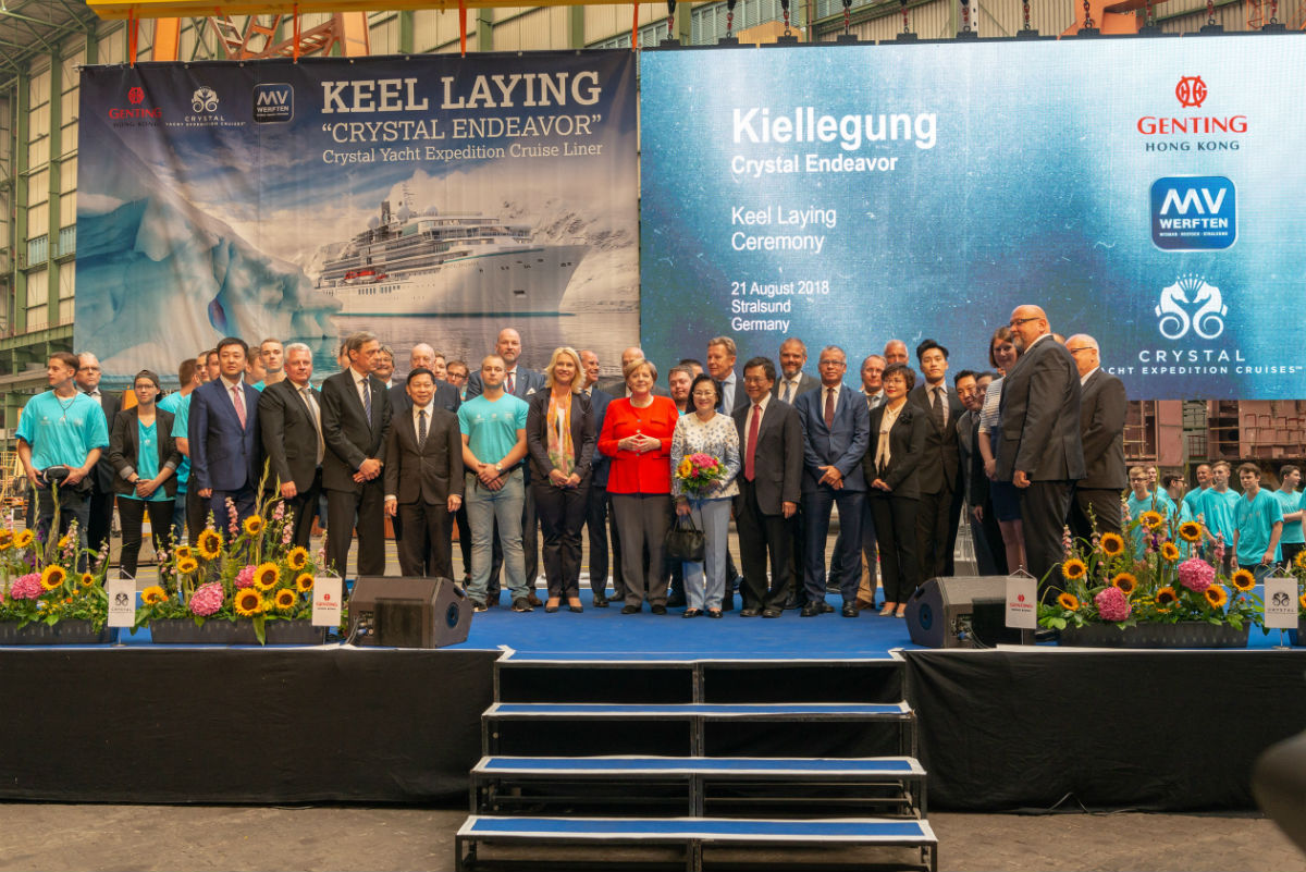 The Crystal Endeavor ceremony was held at MV WERFTEN’s Stralsund shipyard, Germany, and attended by German chancellor Angela Merkel, Crystal president and CEO Tom Wolber, and Genting Hong Kong’s executive chairman and CEO Tan Sri Lim Kok Thay, as well as Mecklenburg Western Pomerania’s prime minister Manuela Schwesig.